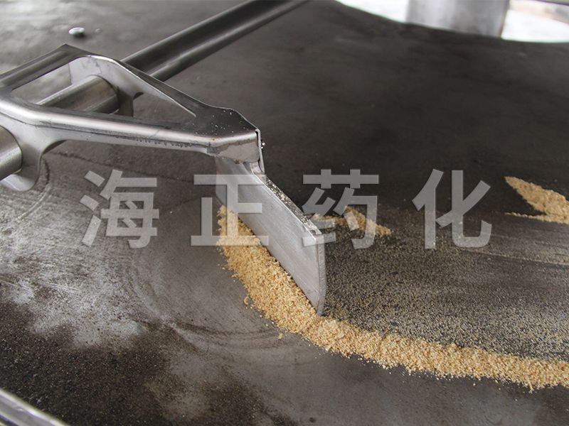 濕物料自加料機連續(xù)地加到干燥器上部第一層干燥盤上,帶有耙葉的耙臂作回轉運動使耙臂作回轉運動使耙葉連續(xù)地翻抄物料。物料沿指數(shù)螺旋線流過干燥盤表面,在小干燥盤上的物料被移送到外緣,并在外緣落到下方的大干燥盤外緣,在大干盤上物料向里移動并從中間落料口落如下一層小干燥盤中。大小干燥盤上下交替排列,物料得以連續(xù)地流過整個干燥機。中空的干燥盤內(nèi)通入加熱介質,加熱介質形式有飽和蒸汽、熱水和導熱油,加熱介質由干燥盤的一端進入,從另一端導出。已干物料從后一層干燥盤落到殼體的底層,后被耙葉移送到出料口排出。濕份從物料中逸出,由設在頂蓋上的排濕口排出,真空型盤式干燥機的濕氣由設在頂蓋上的真空泵口排出。從底層排出的干物料可直接包裝。通過配加翅片加熱器、溶劑回收冷凝器、袋式除塵器、干料返混機構、引風機等輔機,可提高其干燥的生產(chǎn)能力。干燥膏糊狀和熱敏性物料時,可方便地回收溶劑,并能進行熱解和反應操作。